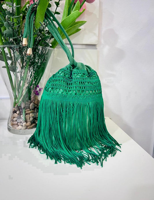 Bombonera crochet flecos esmeralda | Paraiso